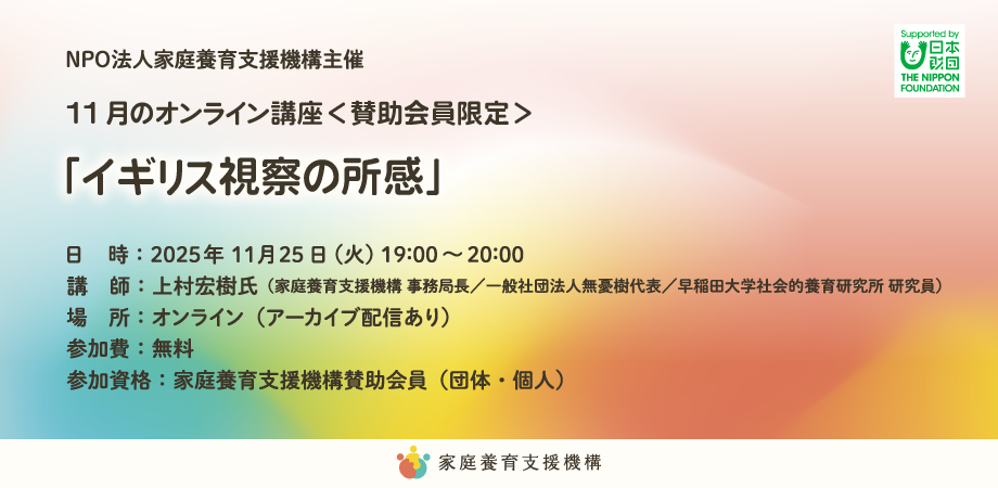 NPO法人家庭養育支援機構 11月のオンライン講座 <賛助会員限定> 「イギリス視察の所感」