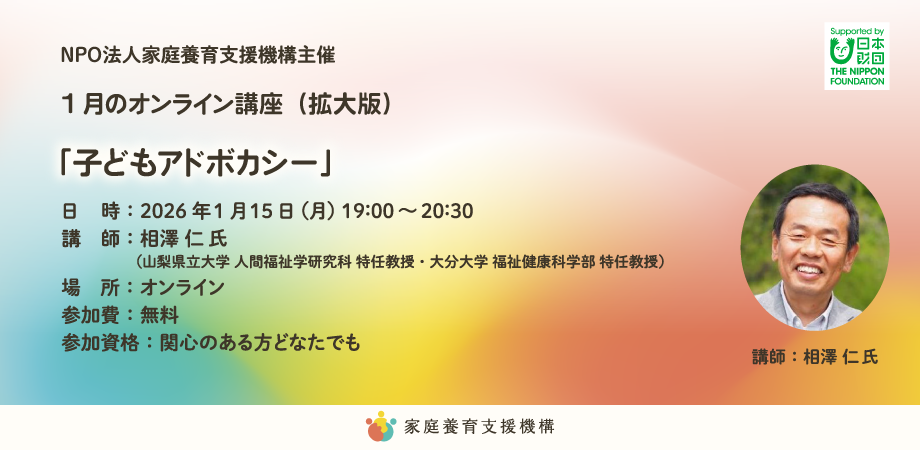 1月のオンライン講座では、山梨県立大学および大分大学の特任教授の相澤仁先生をお迎えし、「子どもアドボカシー」をテーマにお話しいただきます。