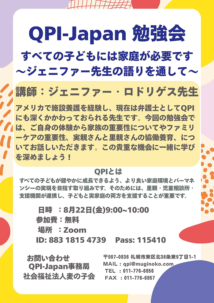 「QPI-Japan 勉強会すべての子どもには家庭が必要です~ジェニファー先生の語りを通して~」
